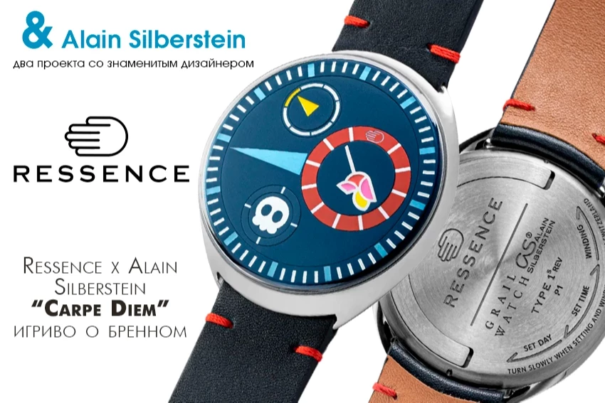 Вторая не менее удачная коллаборация — часы Ressence x Alain Silberstein “Carpe Diem”. Они используют запатентованную дисковую технологию индикации времени компании Ressence с движением счетчиков по циферблату. Только в модель, призывающую помнить о бренности бытия и наслаждаться каждым мгновением отведенной нам жизни, Алан Зильберштейн добавил несколько игривых, но важных символов.
