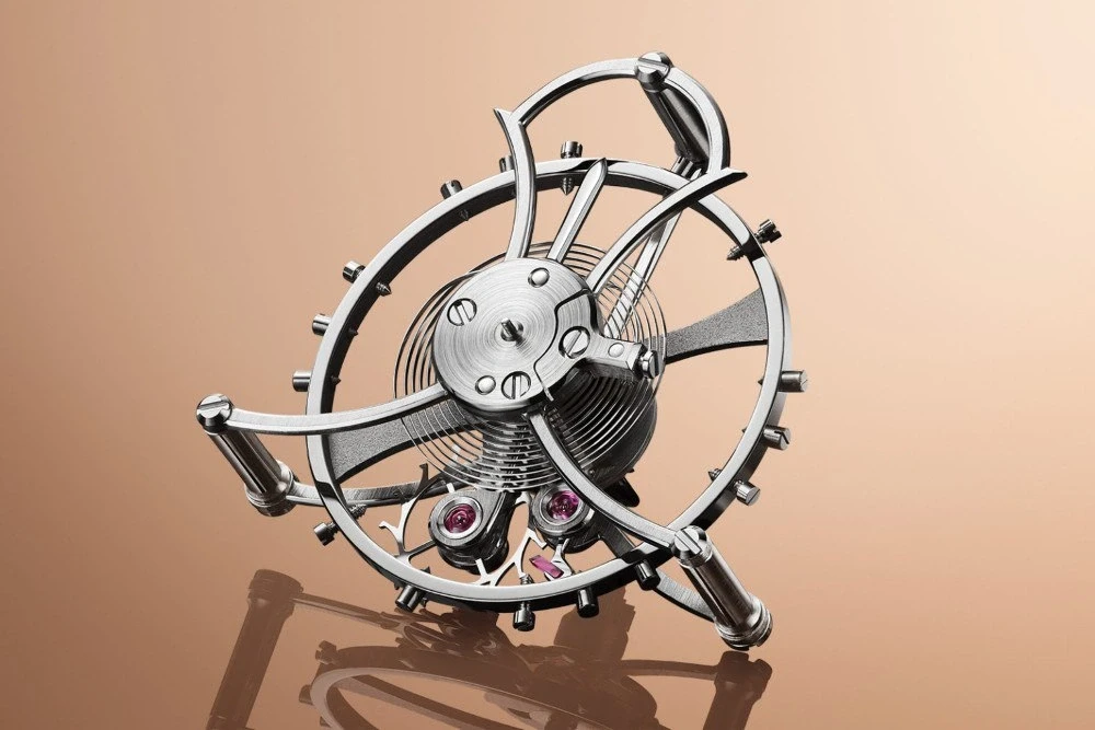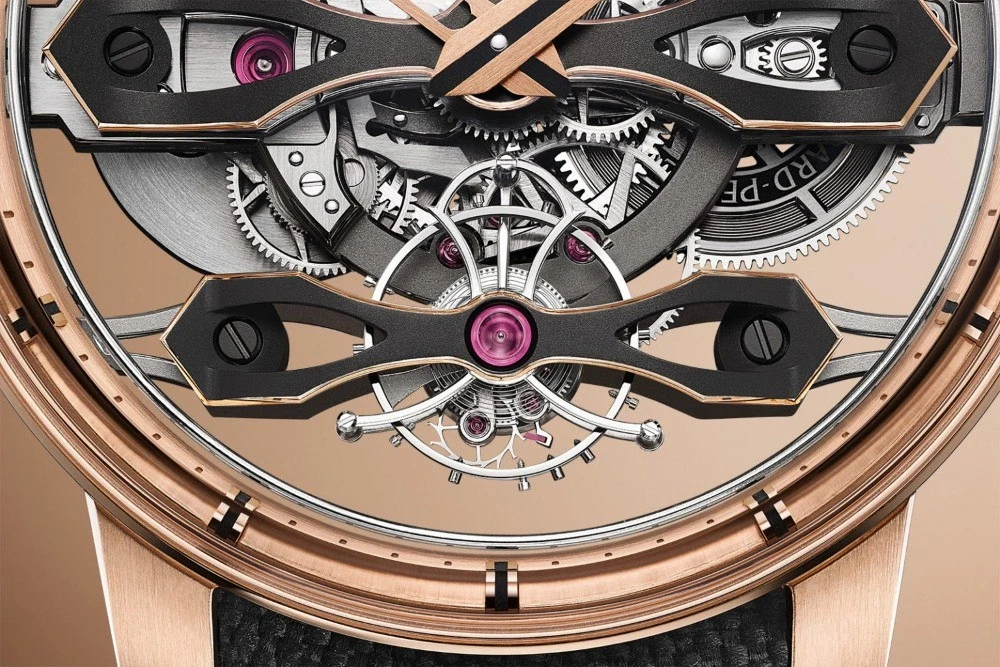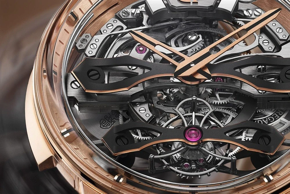 Циферблата нет: крупные ажурные стрелки из золота читаются не слишком легко — возможно, намеренно, чтобы побуждать владельца чаще обращаться к репетиру. Два моста из розового золота с чёрным покрытием в стиле Neo горизонтально пересекают механизм, третий расположен со стороны калибра. Турбийон на отметке шести часов заключён в фирменную клетку в форме лиры и выполняет функцию индикатора секунд.
