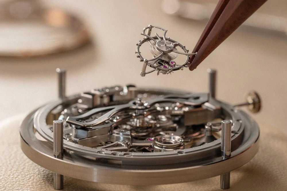 Молоточки репетира вынесены на сторону циферблата — звук распространяется свободнее. Основная платина и мосты выполнены из титана: материал обеспечивает жёсткость и эффективно передаёт вибрации. Платина жёстко привинчена к корпусу, поэтому звук от гонгов беспрепятственно проходит через весь механизм. Гонги и их опорный блок выточены из цельного куска закалённой стали без соединений, которые могли бы гасить вибрации. Центробежный регулятор, управляющий темпом боя, скрыт на задней стороне калибра — чтобы его механический шум не мешал звучанию.