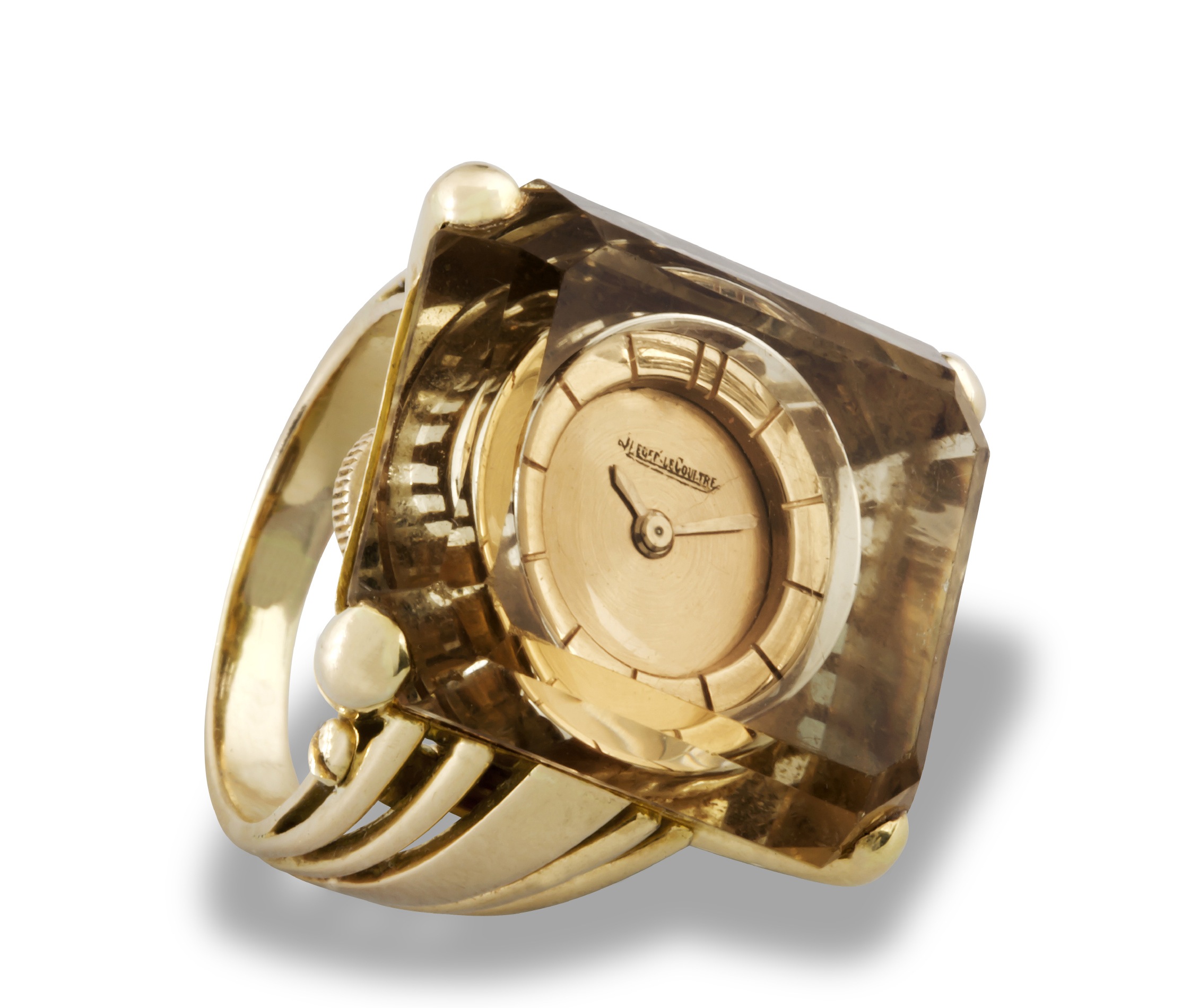 Пятнадцатого мая с аукциона Antiquorum были проданы эксклюзивные часы-кольцо Jaeger-LeCoultre Ring. Прекрасное и редкое украшение сделано из желтого золота в 1950 году. Массивный лимонно-желтый кристалл исполняет роль стекла циферблата. Изящное кольцо с секретом было продано за одиннадцать тысяч двести пятьдесят швейцарских франков. Перед вами не просто ювелирное изделие – это часы мануфактуры Jaeger-LeCoultre. Механизм на семнадцати камнях с родиевым покрытием, имеет уникальный номер, золотой баланс и пружину баланса из вороненой стали. На золотистом циферблате видна индикация часов и минут. Размер циферблата 23х19 миллиметров, размер самого кольца – восемнадцатый.