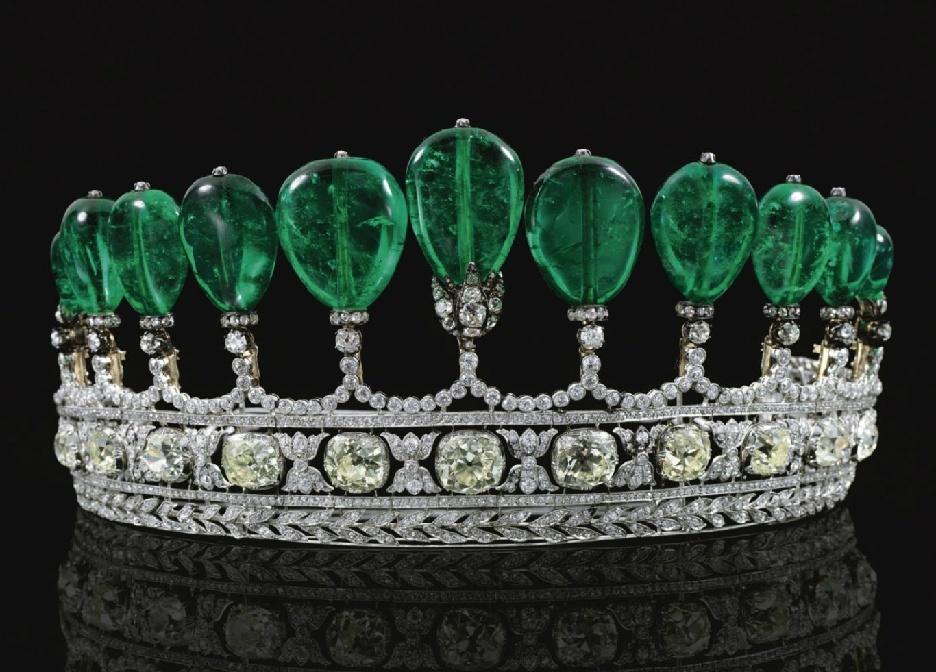 Семнадцатого мая среди блистающих бриллиантами сережек, подвесок, кулонов и ожерелий была обнаружена милейшая для глаза и сердца вещь – диадема, прикраса головы и завершающий штрих прически. Маленькая корона инкрустирована бриллиантами разной формы и огранки общим весом десять целых девяносто девять сотых карата. Верхнюю часть диадемы украшают одиннадцать колумбийских грушевидных изумрудов, которые весят более пятисот карат. Это изделие было создано в тысяча девятисотом году и было собственностью принцессы Катарины Хенкель фон Доннерсмарк. История камней гласит, что они украшали шею Махараджи, а также были в личной коллекции императрицы Евгении в тысяча восемьсот семьдесят втором году.