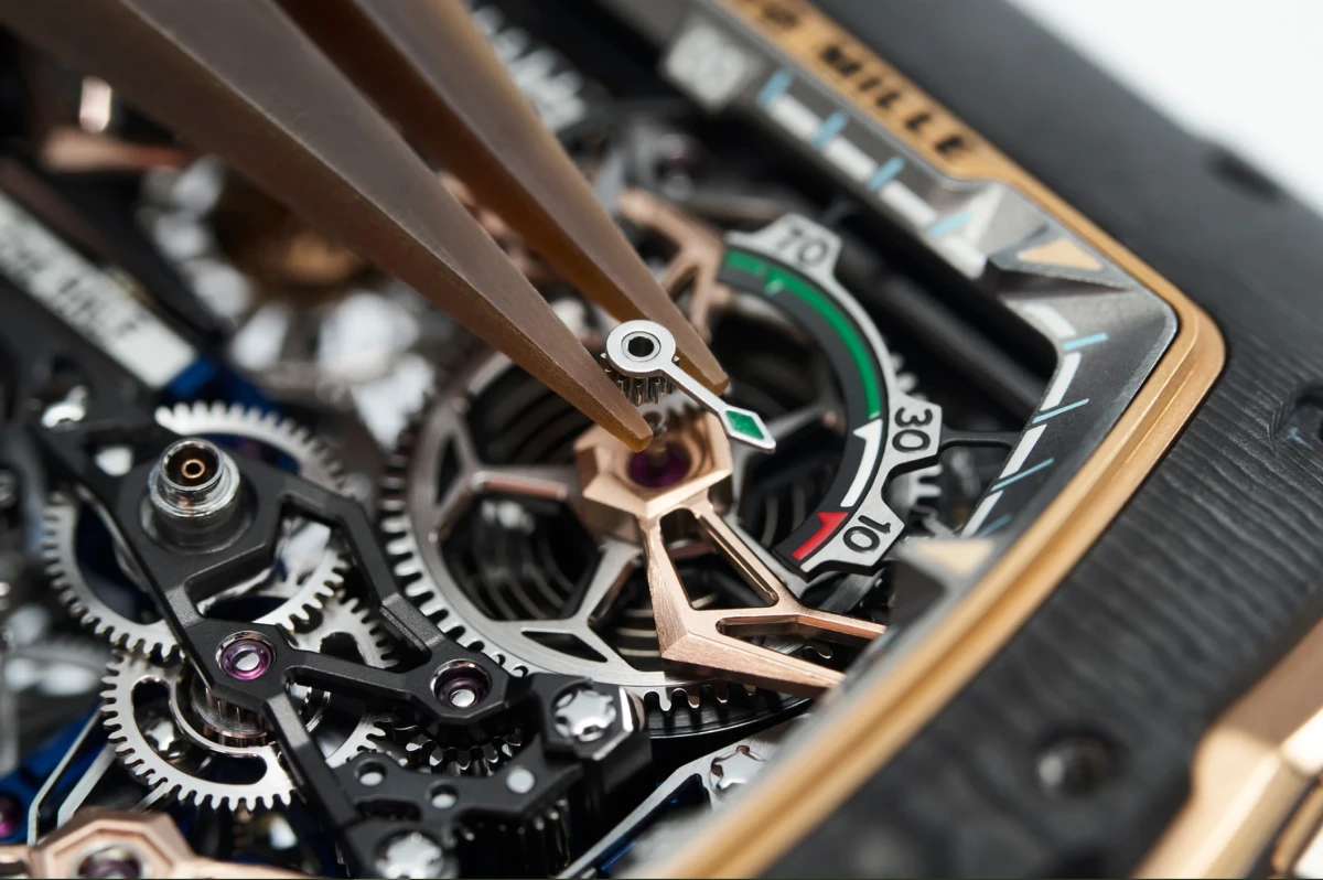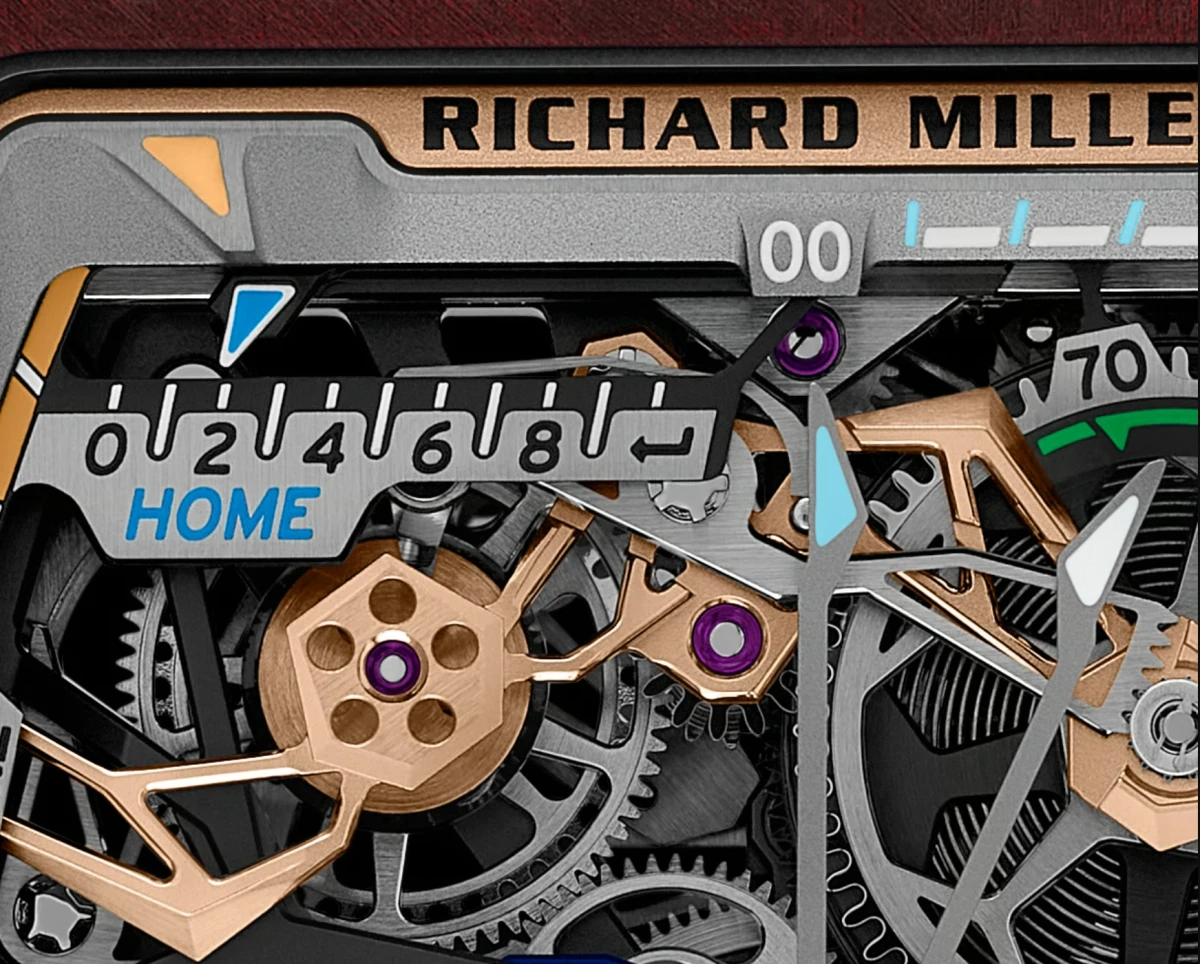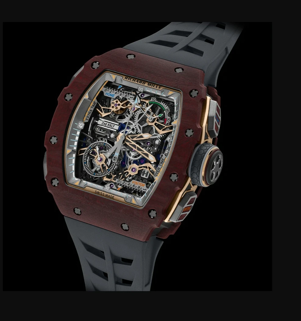 В часах используется скелетонизированный калибр RM41-01 с ручным заводом, турбийоном и функцией flyback-хронографа с запасом хода около 70 часов.