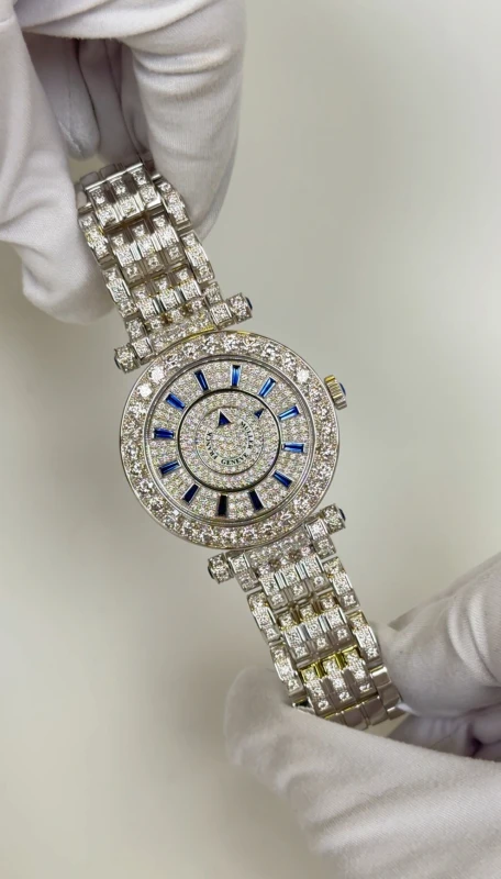 корпус инкрустирован белыми бриллиантами и синими сапфирами