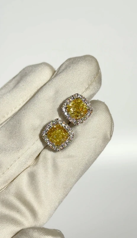 Серьги выполнены из белого золота 750 пробы. 2 Бриллианта огранки Кушон массой 2,01-2,05 кар Fancy Yellow/VVS-VS. GIA 1483529700-7498416087. 36 Бриллиантов круглой огранки массой 0,41 кар G-H/VS.
