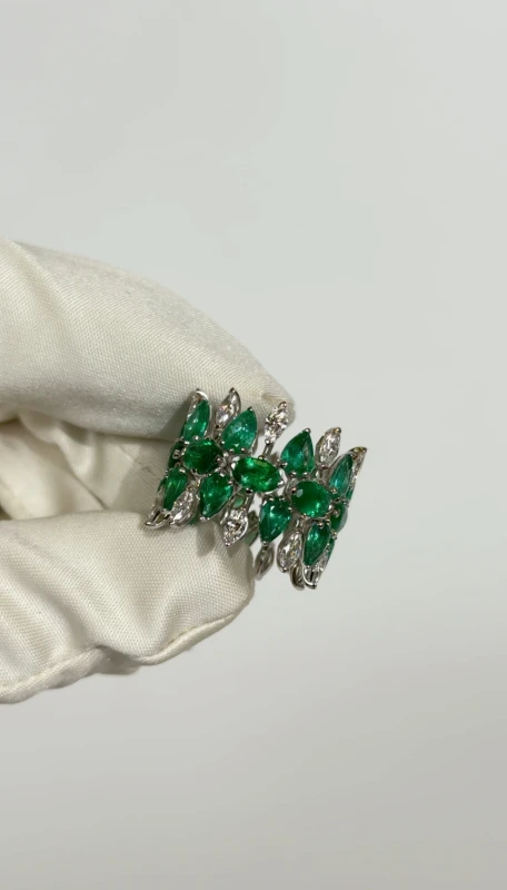 Кольцо выполнено из белого золота 750 пробы. 18 Изумрудов огранки Груша общей массой 8.10 кар. 9 Изумрудов огранки Овал общей массой 4.68 кар. 18 бриллиантов огранки Маркиз  общей массой 2.16 кар. G/VS