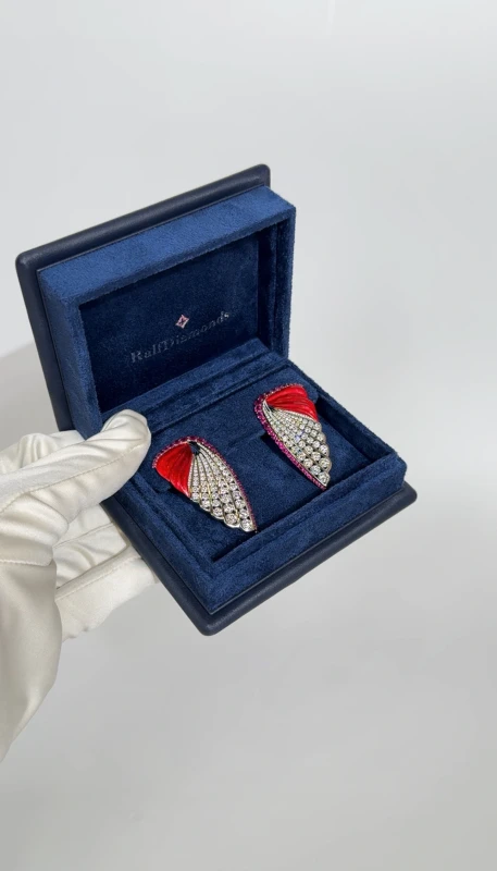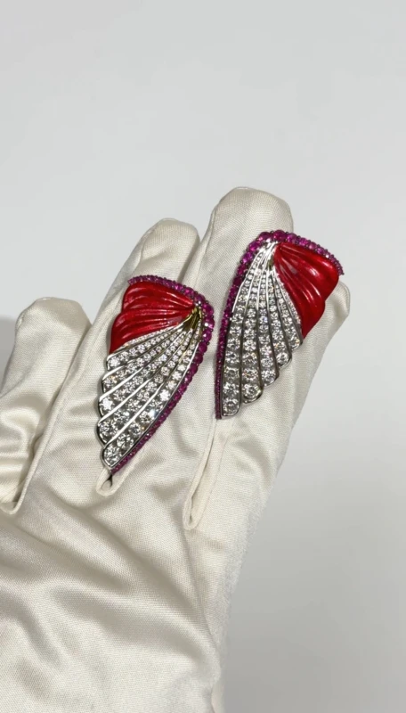 Серьги выполнены из белого золота 750 пробы. 148 Бриллиантов круглой огранки общей массой 7,14 кар. H/VS. 64 Рубина круглой огранки общей массой 3,36 кар. Red.