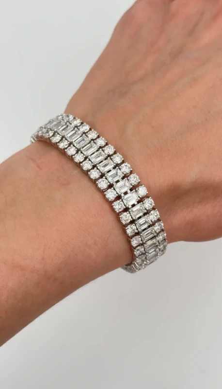Браслет выполнен из белого золота 750 пробы. 40 Бриллиантов огранки Изумруд общей массой 20.30 CT E-H/VVS-VS (GIA на каджый камень). 80 Бриллиантов круглой огранки общей массой 17.12 CT F-H/VVS-VS. Размер: 17.5